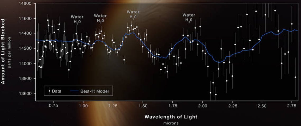 The result of the JWST’s look at WASP-96 b is below. JWST’s Near-Infrared Imager and Slitless Spectrograph (NIRISS) found clear indications of H2O in WASP-96 b’s atmosphere. While this exoplanet isn’t a good specimen for extraterrestrial life - on account of it being all gas and super hot - it was a good test of the capabilities of the NIRISS. In the future, this technology may be able to peer into the atmospheres of potentially life-bearing planets and see signs of gases in the atmosphere such as H2O, CO2, oxygen, and methane that could represent a biosignature - an indication that life exists.